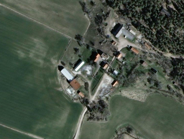 Österby år 2011. Lägg märke till att satelitbilden avslöjar att det finns gamla husgrunder dolda i åkern väster om dagens hus.